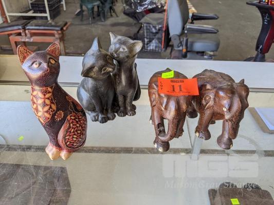 PAIR CARVED ELEPHANTS, (NO TUSKS) & CAT CARVINGS