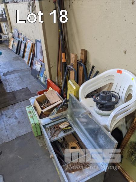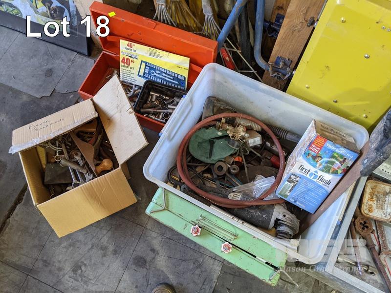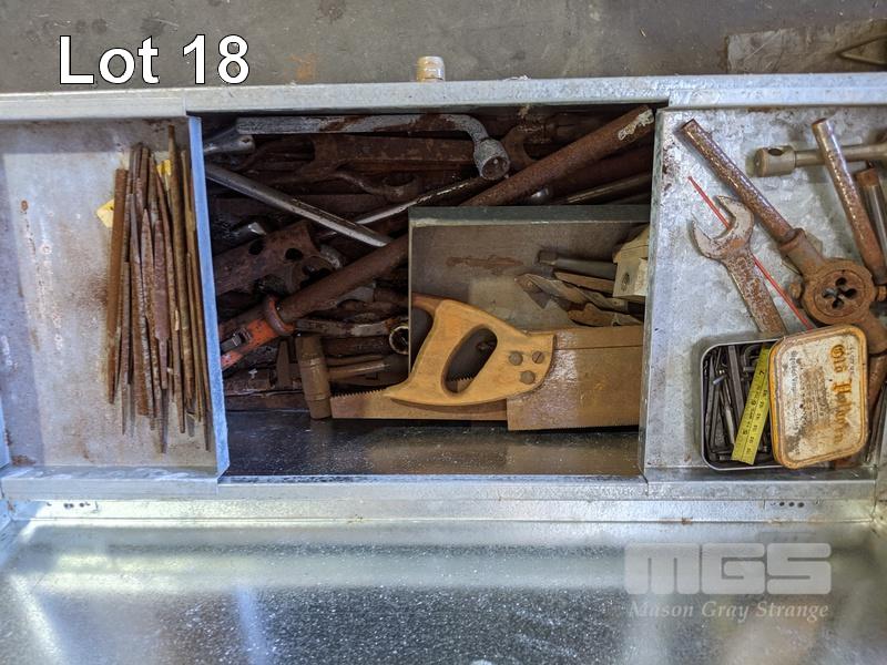 STEEL TOOL BOXES & CONTENTS SOCKET SETS, SPANNERS, WOODWORKING TOOLS, TRESTLE LEGS, ETC