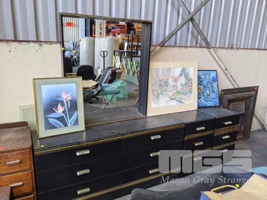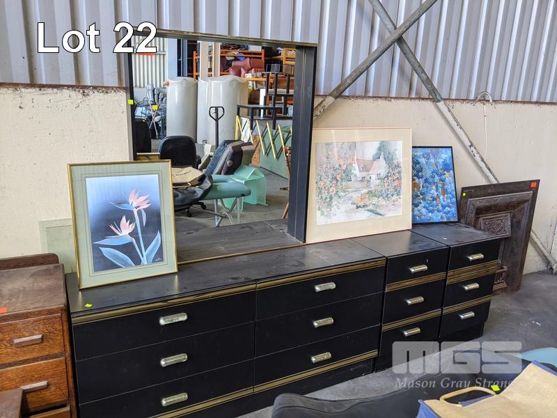 BLACK LAMINATE BEDROOM SUITE,MIRROR BACK DRESSER & 2 x BEDSIDE CABINETS