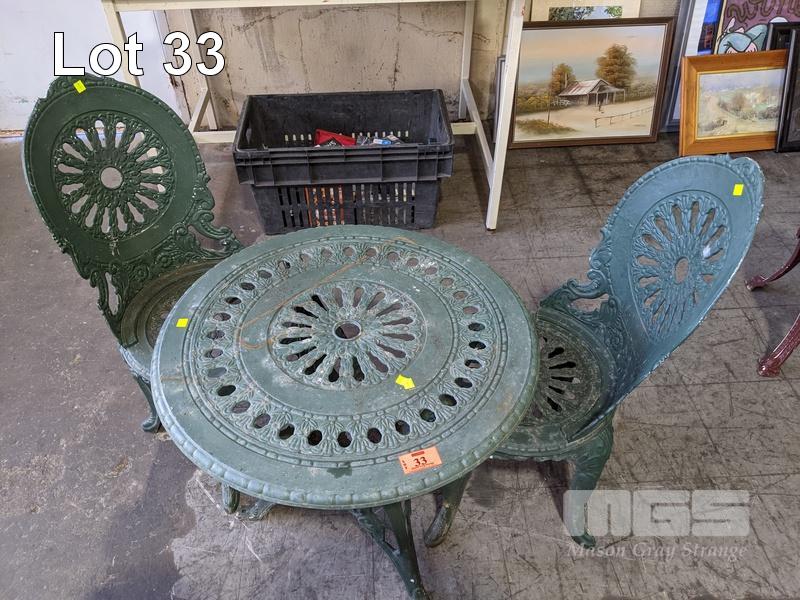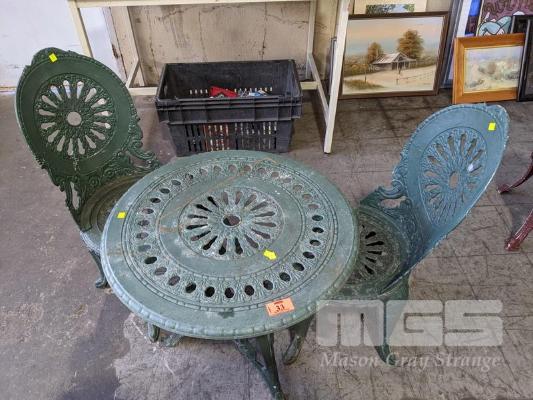 CAST ALUMINIUM 3 PIECE PATIO SETTING, CIRCULAR TABLE & 2 x GREEN CHAIRS