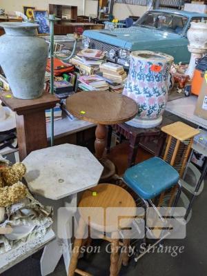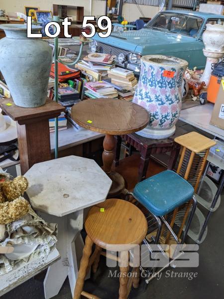 STOOLS, CD TOWER, PLANTER STANDS, SIDE TABLE, SHELF UNITS, ETC