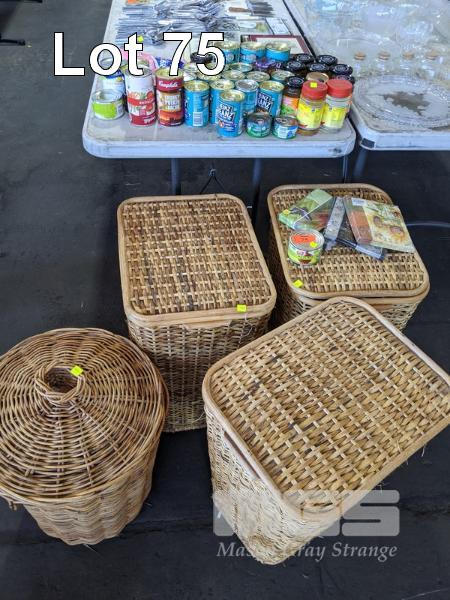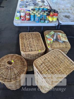 4 x WICKER LAUNDRY BASKETS & ASSORTED GROCERIES