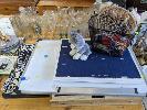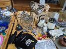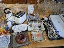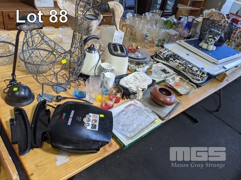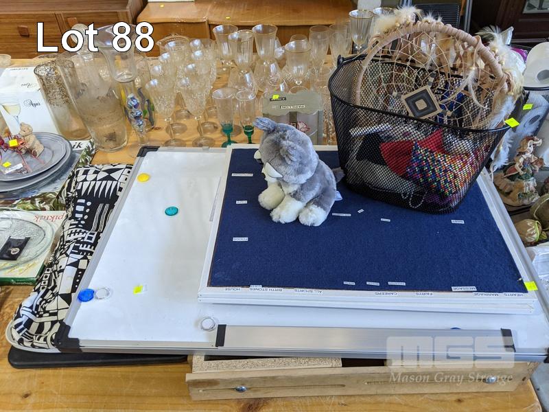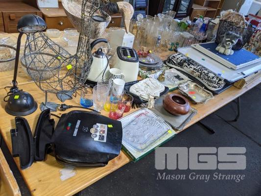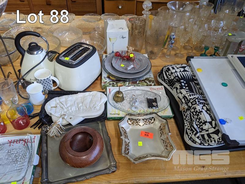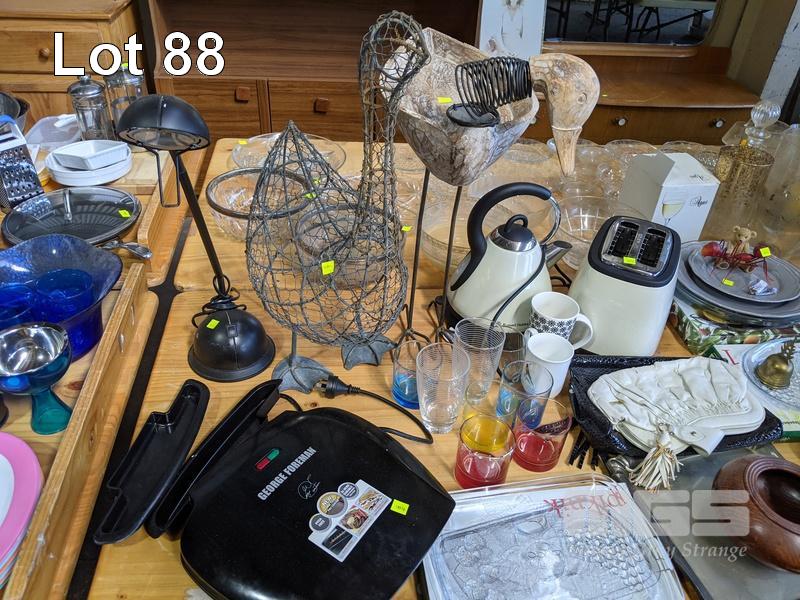 ASSORTED PINBOARDS, WHITEBOARD, RUSSELL HOBBS TOASTER & KETTLE, GARDEN ORNAMENTS, TRAYS, ETC