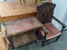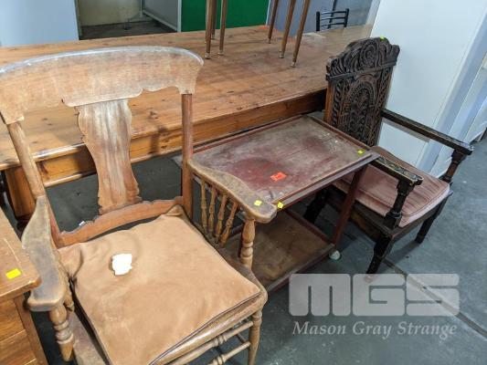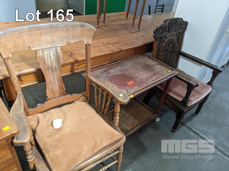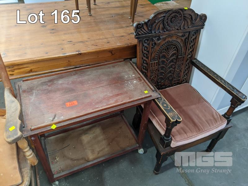 TIMBER TRAYMOBILE, ORNATE CARVED OAK ARM CHAIR & TIMBER ARM CHAIR