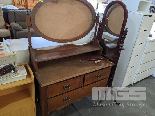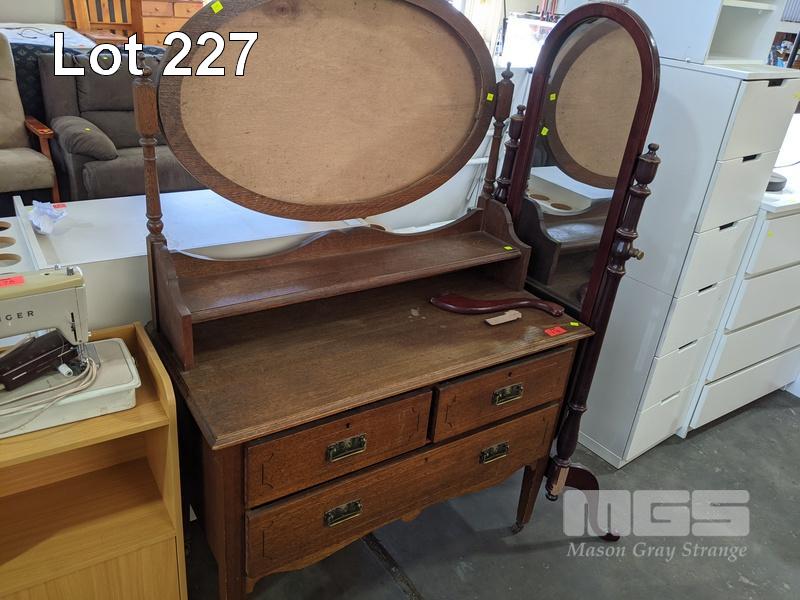 OAK DRESSER, CERAMIC CASTORS, BRASS HANDLES, (MIRROR MISSING) & TIMBER CHEVAL MIRROR (1 x LEG BROKEN)
