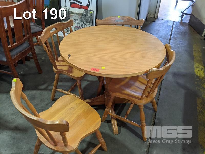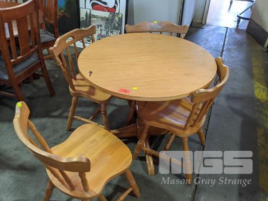 PINE 5 PIECE DINING SUITE INC ROUND TABLE, SINGLE PEDESTAL WITH 4 x SPINDLE BACK CHAIRS