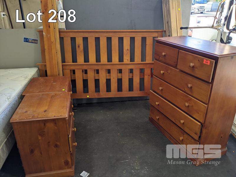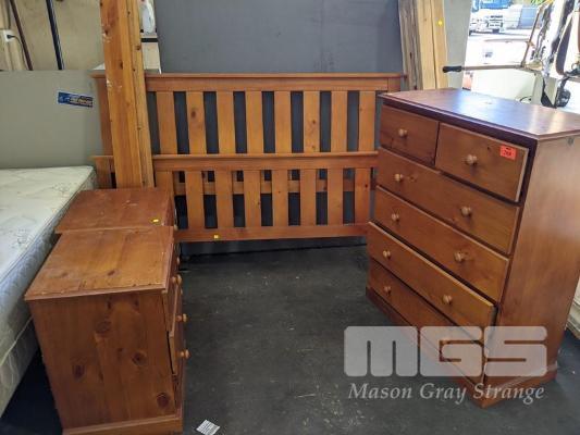 PINE 4 PIECE BEDROOM SUITE INC QUEEN BED, TIMBER SLAT, TALLBOY & PAIR BEDSIDE CABINETS