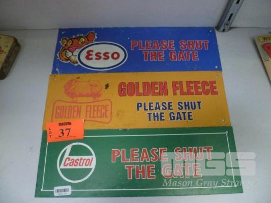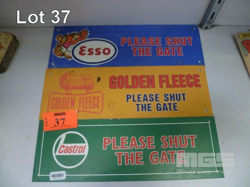 3 x REPRODUCTION "SHUT THE GATE" TIN SIGN, INC GOLDEN FLEECE & ESSO