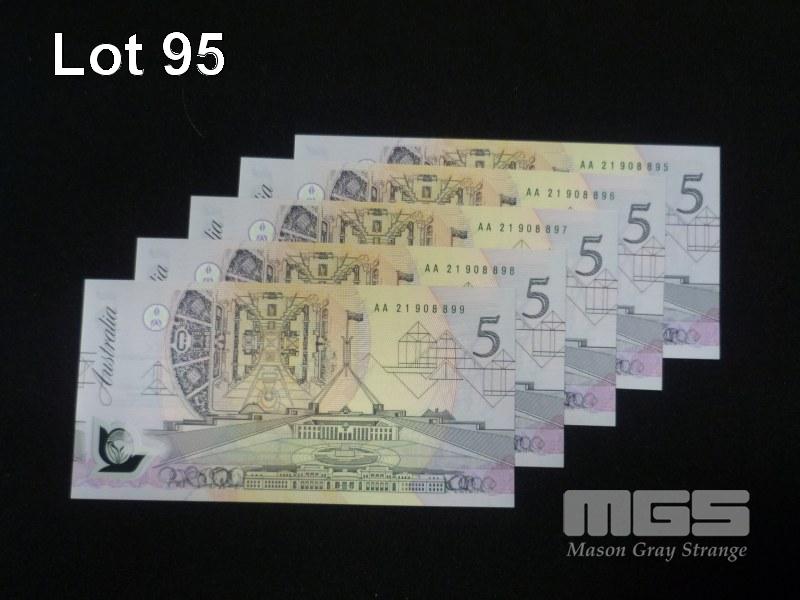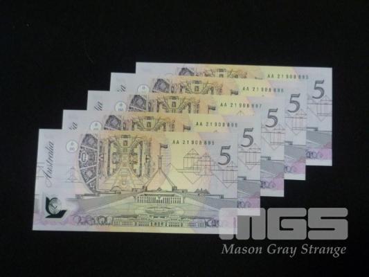 1992 5 x $5.00 CONSECUTIVE NOTES 1ST POLYMER NOTE UNC MEDIUM GREEN