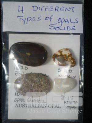 4 X ASSORTED SOLID OPALS, INC; BOULDER 18.2 CTS, MATRIX 3.9 CTS, QUARTZ 10.6 CTS, WHITE 3.15 CTS