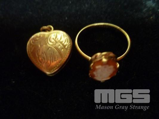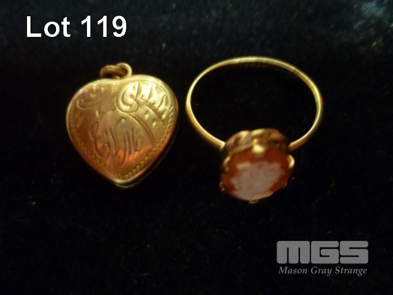 GOLD RING SET WITH CAMEO, MARKED, 9CT LUSTRE, 1.33grams & GOLD HEART PENDANT, MARKED 9CT, 2.64grams