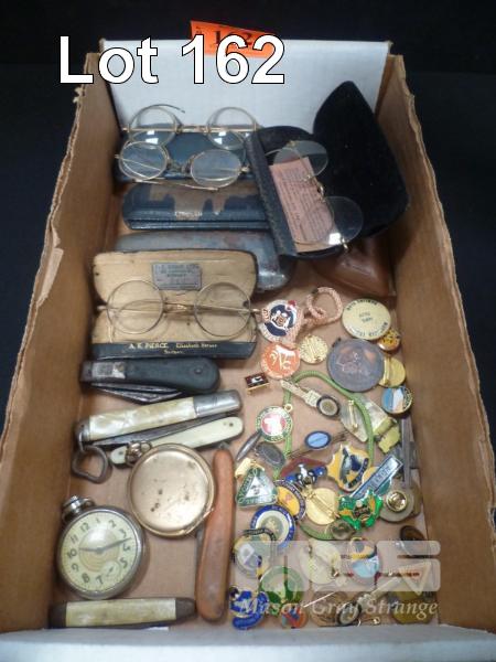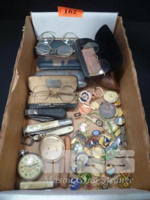 ASSORTED COLLECTABLES, VINTAGE GLASSES, POCKET KNIVES, WATCH & BADGES