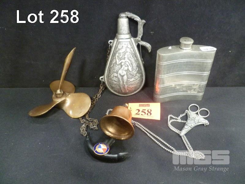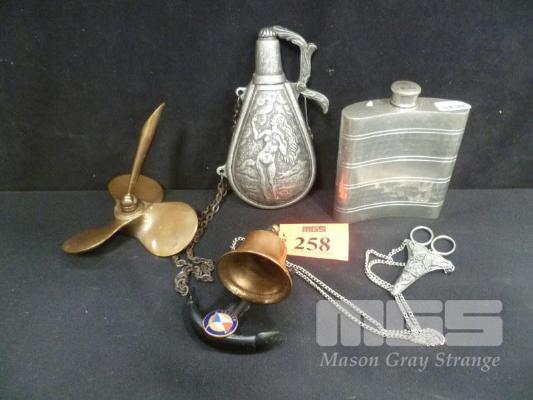 CURIOS INCLUDING HIP FLASK, EMBOSSED GUN POWEDER POUCH, BRASS PROPELLER, PEN HOLDER, BELL & SCISSOR POUCH ON CHAIN