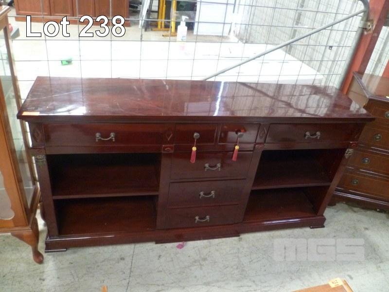WOHLERS MAHOGANY HIGH GLOSS DINING ROOM BUFFET UNIT, 7 DRAWER WITH SIDE SHELF COMPARTMENT, BRASS HANDLES & FEATURES