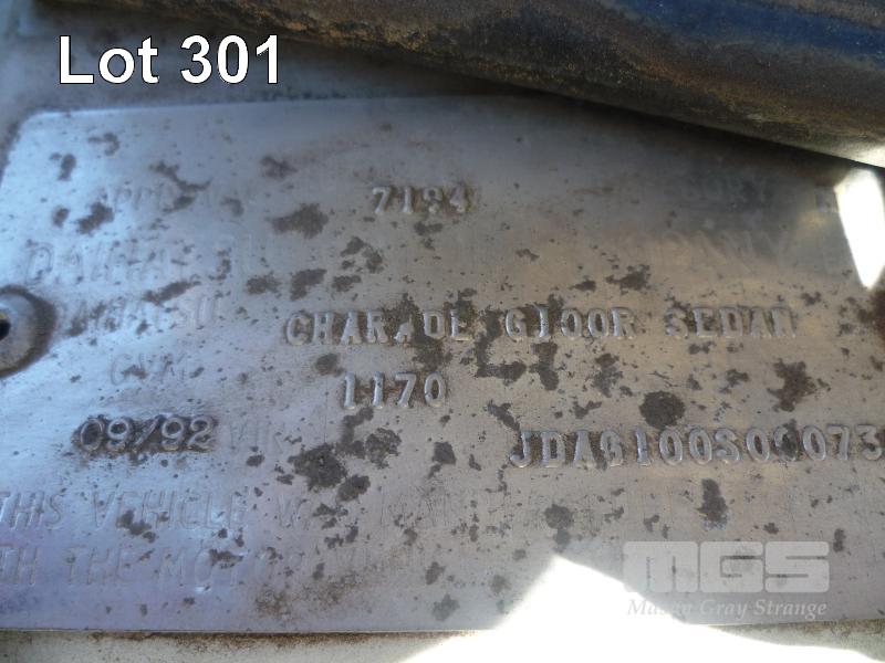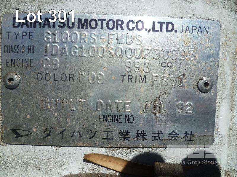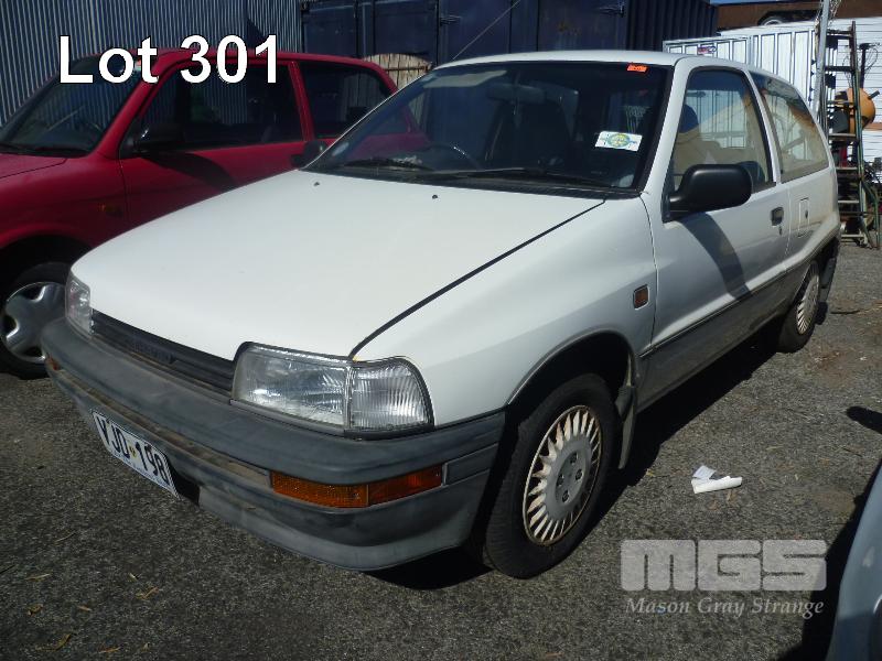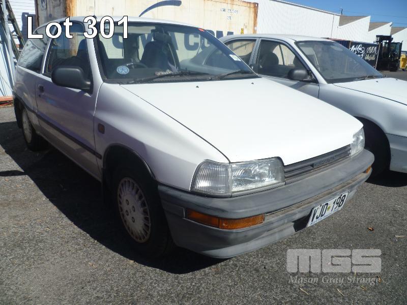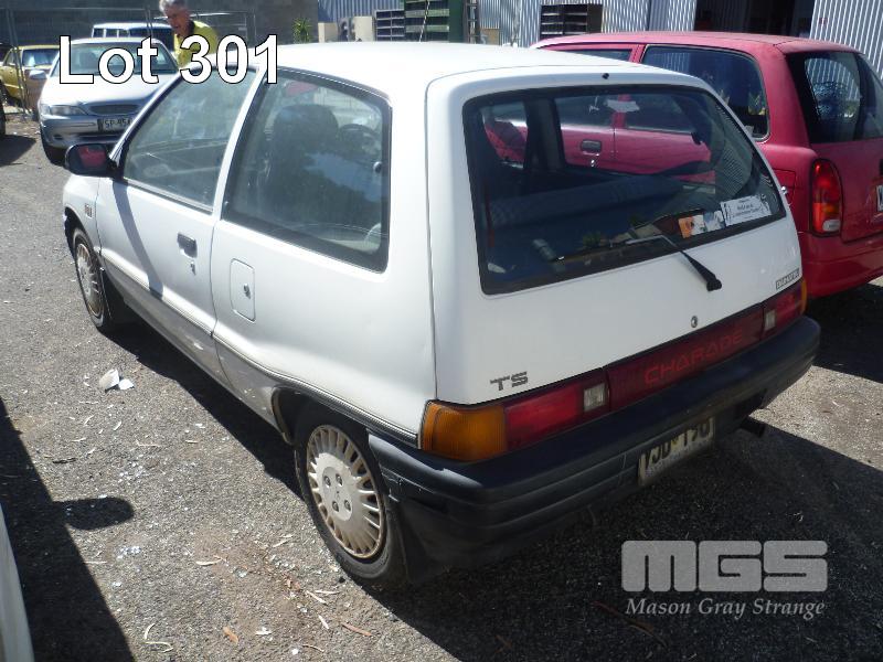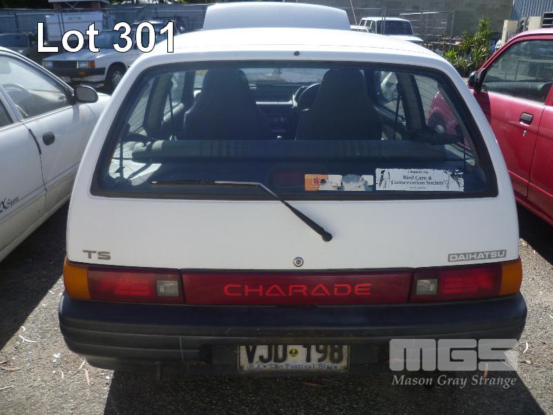 1992 DAIHATSU CHARADE HATCH REG: VJD 198 (SA) (EXPIRED) VIN: JDAG100S000730695 ENG: 1895121 ODO: 170,342 4 CYLINDER, 5 SPEED MANUAL, PETROL, WHITE, 3 DOORS, 5 SEAT, AIR CON, POWER STEERING, SPARE WHEEL (WITH PAPERS, WITH 1 KEY/S, WITH OWNER'S MANUAL, WITH SERVICE BOOKS) CONDITION: BODY - PAINT FADE, MINOR RUST REAR QTR PANEL - DENTED ENGINE - NOT RUNNING