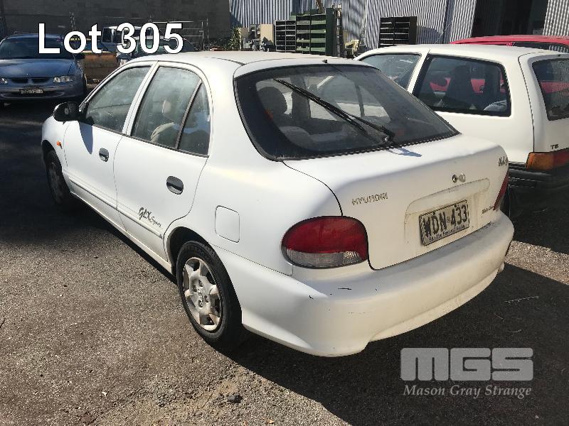 1998 HYUNDAI EXCEL GLX SEDAN REG: WDN-433 (SA) VIN: KMHUA31NPWU363446 ENG: G4FKWS32829 ODO: 199,659 KM 4 CYL, 5 SPEED MANUAL, PETROL, WHITE, 4 DOORS, 5 SEAT, AIR CON, CD PLAYER, POWER STEERING, SPARE WHEEL (NO PAPERS, NO OWNER'S MANUAL, NO SERVICE BOOKS) CONDITION: OVERALL - POOR CONDITION