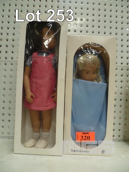 SASHA DOLL & SASHA BABY, 1 x SASHA BRUNETTE, RED PINAFORE, 1 x BABY NEST, FAIR HAIR No 111 & 513S, MADE IN ENGLAND, NEW IN BOX