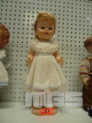 PEDIGREE CELLULOID BABY DOLL ON DISPLAY STAND WITH FLORAL & LACE DRESS & RED SHOES, SLEEPING EYES, MOVING LIMBS & BLONDE HAIR