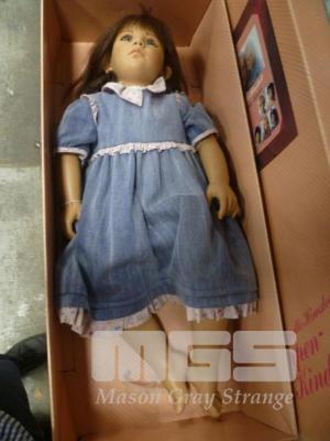 ANNETTE HIMSTEDT PUPPEN KINDER, YOUNG GIRL DRESS DOLL ON DISPLAY STAND, 2'6" (H), DENIM DRESS, NEW IN BOX