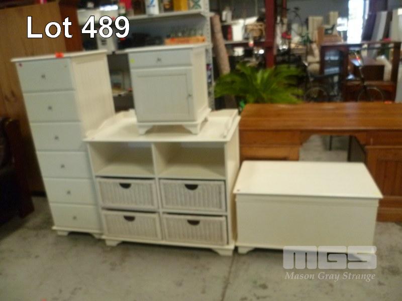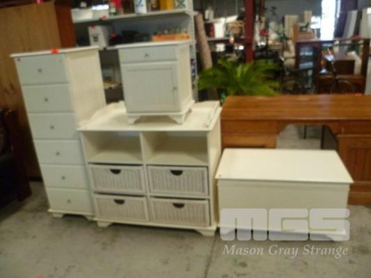 WHITE PAINTED TIMBER BEDROOM FURNITURE INC NARROW TALLBOY, BEDSIDE CABINET, BLANKET BOX & BABY CHANGE TABLE WITH UNDERSTORAGE