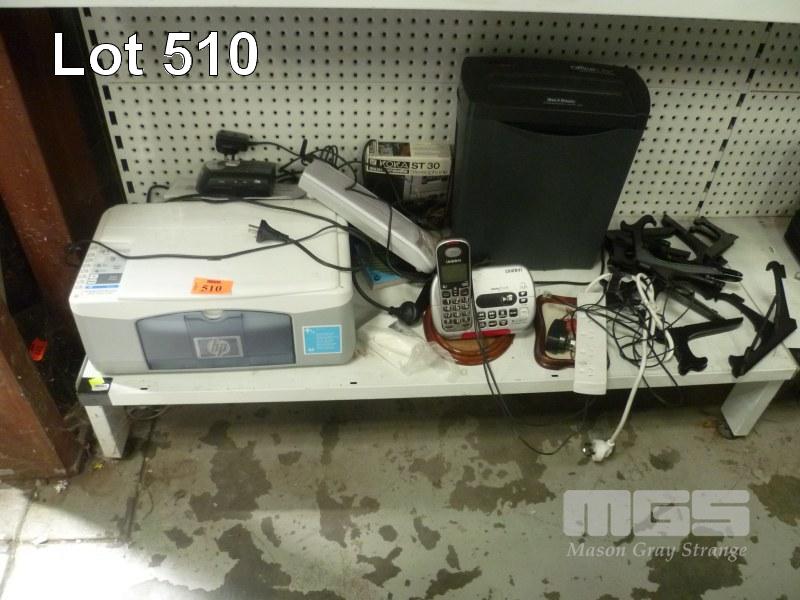 HP PRINTER, PAPER SHREDDER, LAMINATOR, PLATE STANDS, ETC