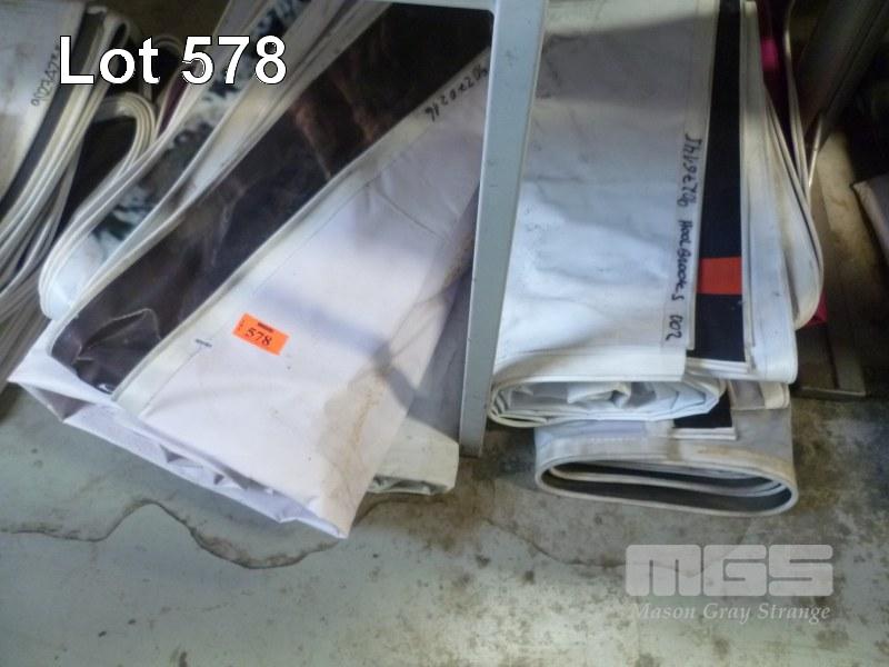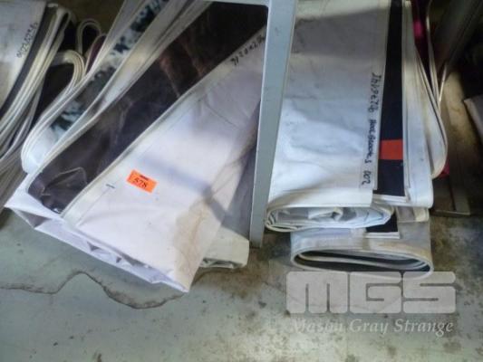 5 x ASSORTED, HEAVY DUTY ADVERTISING TARPS, UNKNOWN SIZES