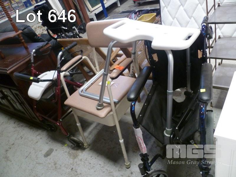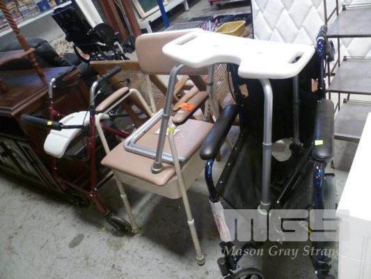 BLUE WHEELCHAIR, RED MOBILITY WALKER & ASSIST CHAIRS