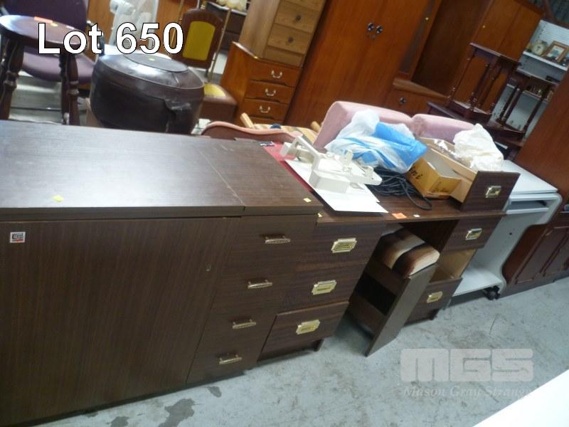 CREST SEWING CABINET, TIMBER LAMINATE DESK & GREY MELAMINE MOBILE DESK