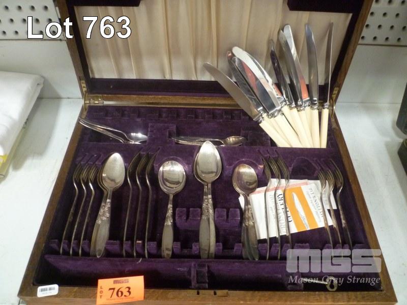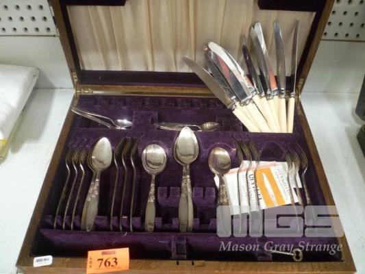 GROSVENOR CUTLERY SET WITH BONE HANDLE KNIVES IN TIMBER CANTEEN (INCOMPLETE)