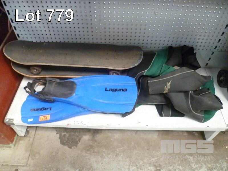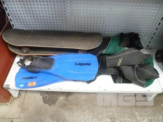 TITANIUM WET SUIT, SIZE LARGE, LAGUNA FLIPPERS & 2 x SKATEBOARDS