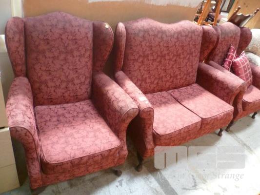 BURGUNDY PATTERNED FABRIC 3 PIECE LOUNGE SUITE, WING BACK, ROLL ARM, INC 2 SEATER & 2 x SINGLES