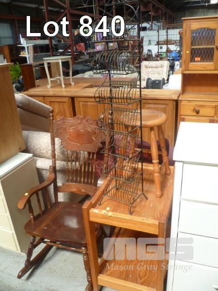 TIMBER ROCKING CHAIR, SMALL STOOL, MOBILE TROLLEY & CD TOWER