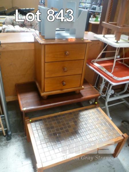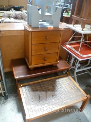 TILE TOP COFFEE TABLE, TIMBER VENEER COFFEE TABLE & PINE BEDSIDE CABINET