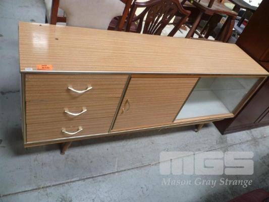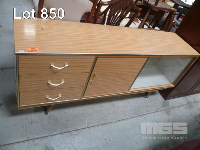 TIMBER LAMINATE, MID CENTURY SIDEBOARD, 3 DRAWER, GLASS SHELF