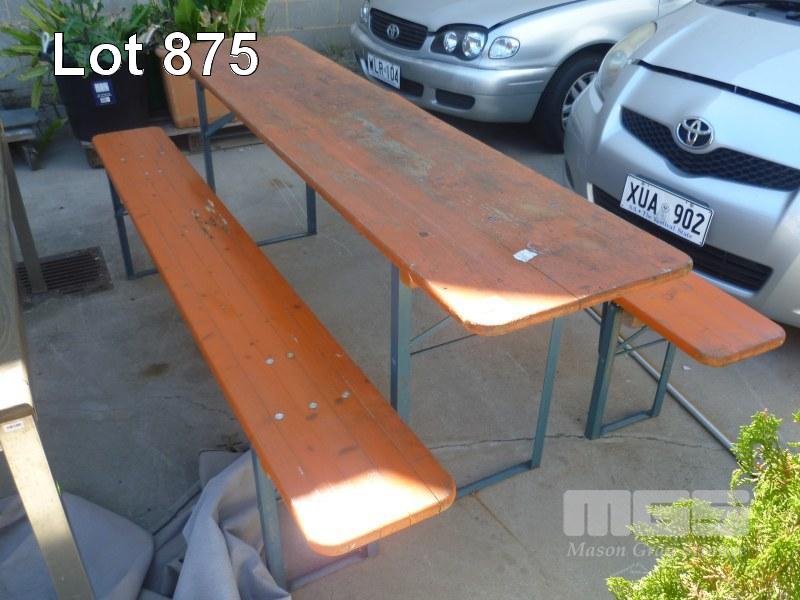 FOLDING TRESTLE TABLE, 2 x FOLDING MATCHING BENCH SEATS, PINE, 220cm (L) (1 BENCH WITH OLD SMALL TERMITE ROT)