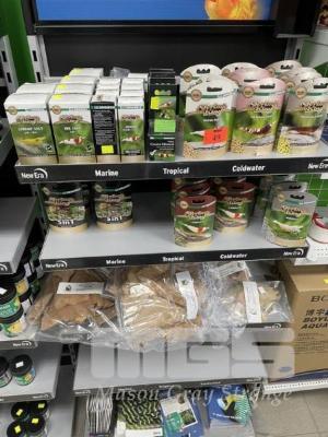 VITALIS RACK & CONTENTS INCLUDING 11 x DENNERLE SHRIMP FOOD STICKS, 5 x DENNERLE SHRIMP MINERAL FLUID, 4 x DENNERLE SHRIMP MINERAL POWDER, 4 x DENNERLE SHRIMP HUMAN FLUID, 4 x DENNERLE SHRIMP HARDENING SALT, 2 x DENNERLE SHRIMP MULTIMINERAL SALT, 4 x DENNERLE 5 IN 1 PACK, 5 x DENNERLE COMPLETE FOOD STICKS, 4 x DENNERLE MINERAL FOOD STICKS, 15 x INDIAN ALMOND LEAF PACKETS