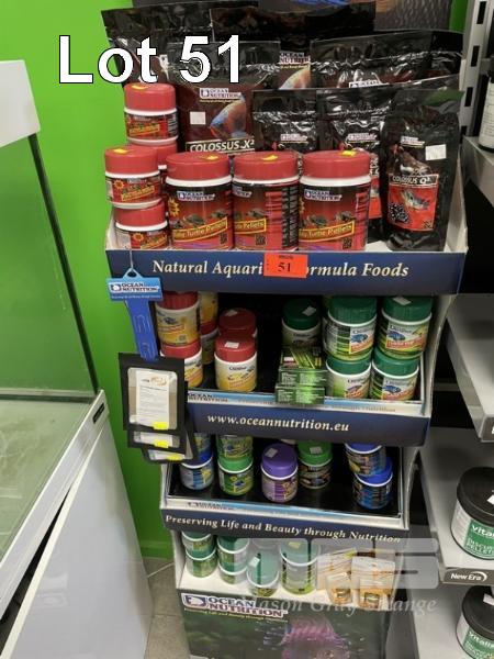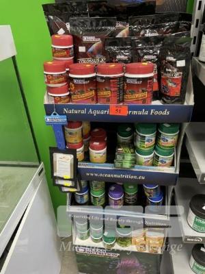 OCEAN NUTRITION RACK & CONTENTS INCLUDING 9 x COLOSSUS FISH PELLETS, 8 x BABY TURTLE PELLETS, 4 x CICHLID OMNI PELLETS, 13 x CICHLID VEGI PELLETS, 2 x BRINE SHRIMP EGGS, 3 x FRY STARTER FORMULA, 2 x FORMULA ONE FLAKES, 2 x FORMULA 2 FLAKES, 1 x PRIME REEF FLAKES, 2 x BRINE SHRIMP FLAKES, 1 x FORMULA 2 MARINE PELLETS, 2 x FORMULA ONE MARINE PELLETS, 12 x ADULTS TURTLE PELLETS, 7 x INSTANT BABY BRINE SHRIMP