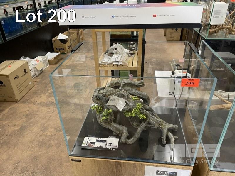 WATERBOX AQUARIUM, 60 x 45 x 45cm (L), WOODGRAIN CABINET, 1 x DOOR, 90 x 60 x 45cm, GIANT TREE ROOT WITH PLANTS WRGB LED LIGHT, 60cm, RRP $1050