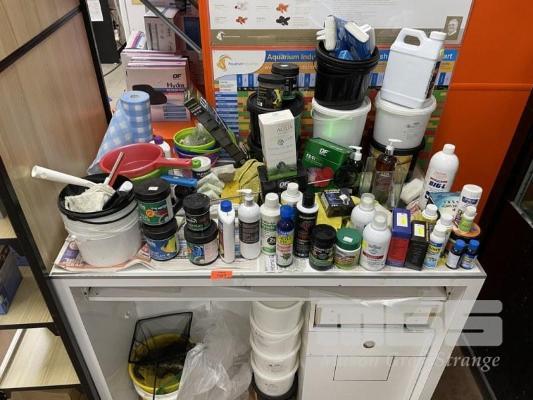 FEEDING BENCH & CONTENTS, PART USED AND OPEN CONTAINERS OF WATER TREATMENT, AQUA FEEDING, FISH HEALTH SUPPORT & NATURAL FISH MEDICINE, DYMAX, OCEAN NUTRITION, NEW ERA & OCEAN FREE