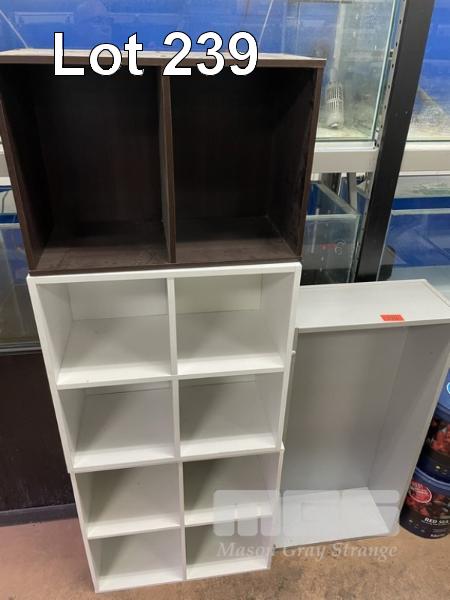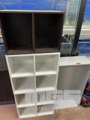 4 x SHELF UNITS, VARIOUS SIZES, GREY, WHITE & BROWN