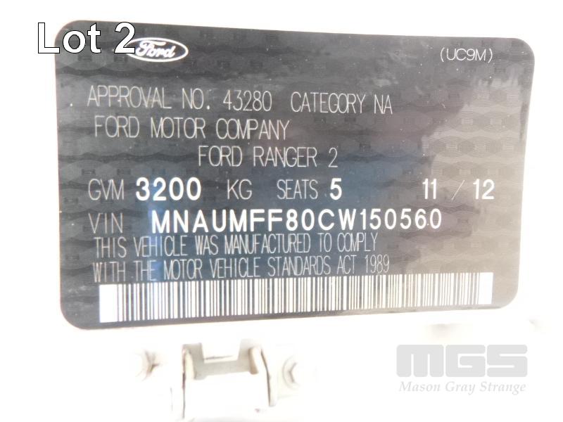 2012 FORD RANGER HI RIDER PX DUAL CAB TUB UTE REG: S197 AWL VIN: MNAUMFF80CW150560 ENG: P4AT1058777 ODO: 123,536kms INDICATED 2.2 LITRE, 4 CYLINDER, 6 SPEED MANUAL TRANSMISSION, TURBO DIESEL, WHITE DUCO, 4 DOORS, 5 SEAT, RWD ABS, AIR BAG, AIR CON, BLUETOOTH, CD PLAYER, CENTRAL LOCKING, CRUISE CONTROL, POWER STEERING, POWER WINDOWS, SPARE WHEEL, TONNEAU COVER, TRACTION CONTROL, KEY #28 (WITH PAPERS, WITH 1 KEY/S, WITH OWNER'S MANUAL, WITH SERVICE BOOKS) CONDITION: - MINOR SCRATCHES & CHIPS