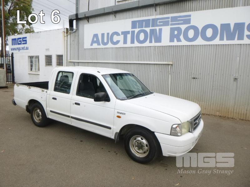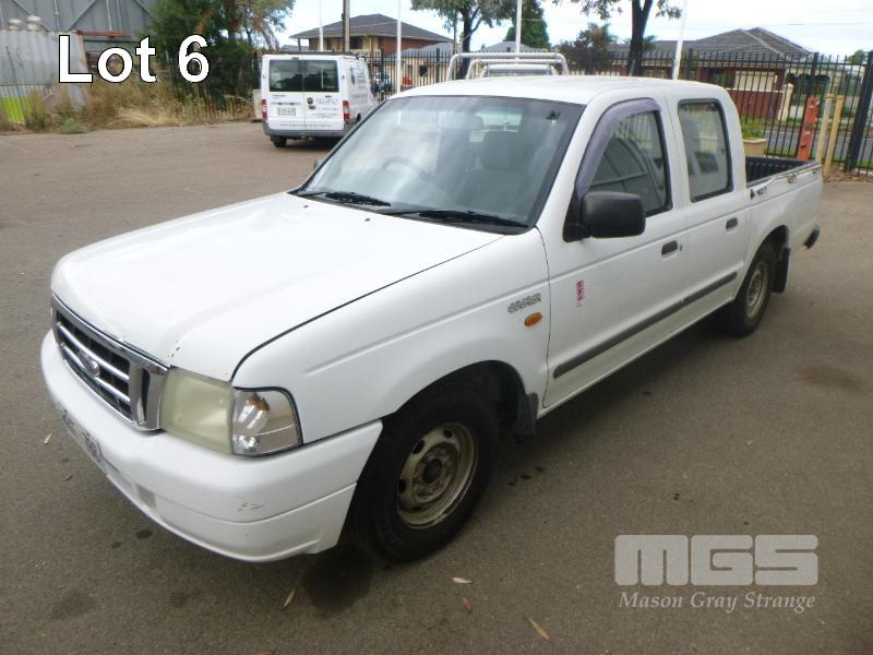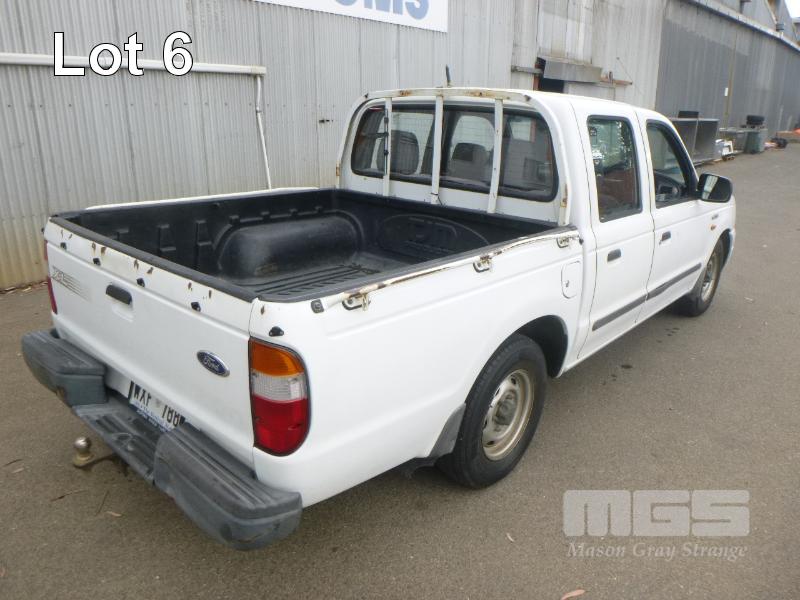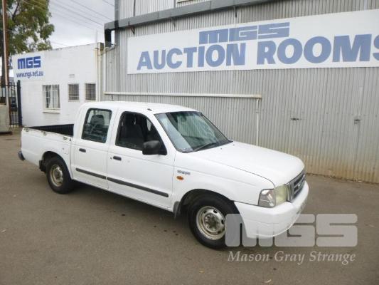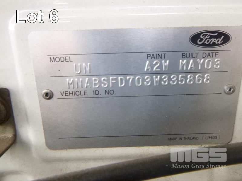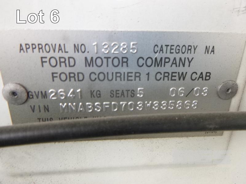 2003 FORD COURIER PG XL DUAL CAB TUB UTE RWD REG: WXF 788 VIN: MNABSFD703W335868 ODO: 414,264kms INDICATED 2.6 LITRE, 4 CYLINDER, 4 SPEED AUTOMATIC TRANSMISSION, PETROL, WHITE DUCO, 4 DOORS, 5 SEAT, RWD AIR CON, POWER STEERING, POWER WINDOWS, SPARE WHEEL, TOW BAR, TUB LINER, PASSENGER WEATHER STRIP KEY #18 (WITH PAPERS, WITH 1 KEY/S, WITH OWNER'S MANUAL, WITH SERVICE BOOKS) CONDITION: - CRACKED FRONT BUMPER - DENTS IN REAR BUMPER - BENT TIE RAILS - SCRATCHES & PAINT CHIPS - REBUILT HEAD