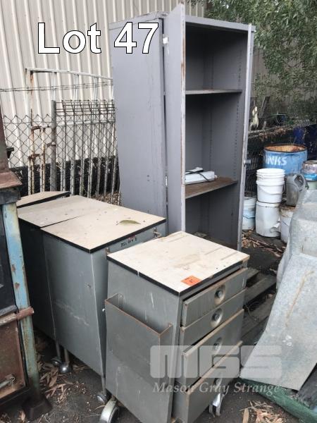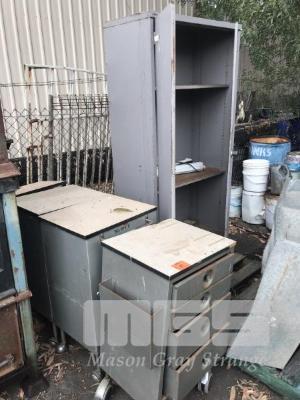 4 x MOBILE DRAWER UNITS, STEEL & 2 DOOR STATIONERY CABINETS, 180cm & 2 x GALV STOCK SHELVES