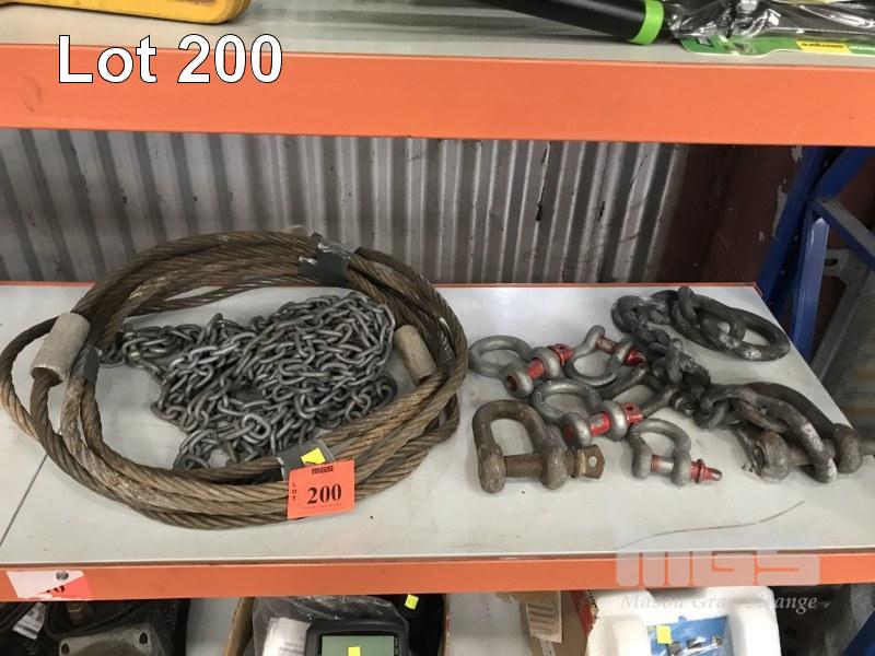 7 x ASSORTED SHACKLES, WIRE ROPE & SINGLE LEG CHAIN