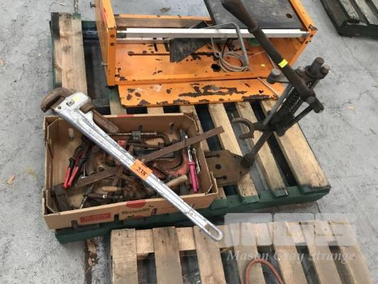 ASSORTED CLAMPS, PIPE WRENCH, BENCHTOP DRILL PRESS FRAME, ETC