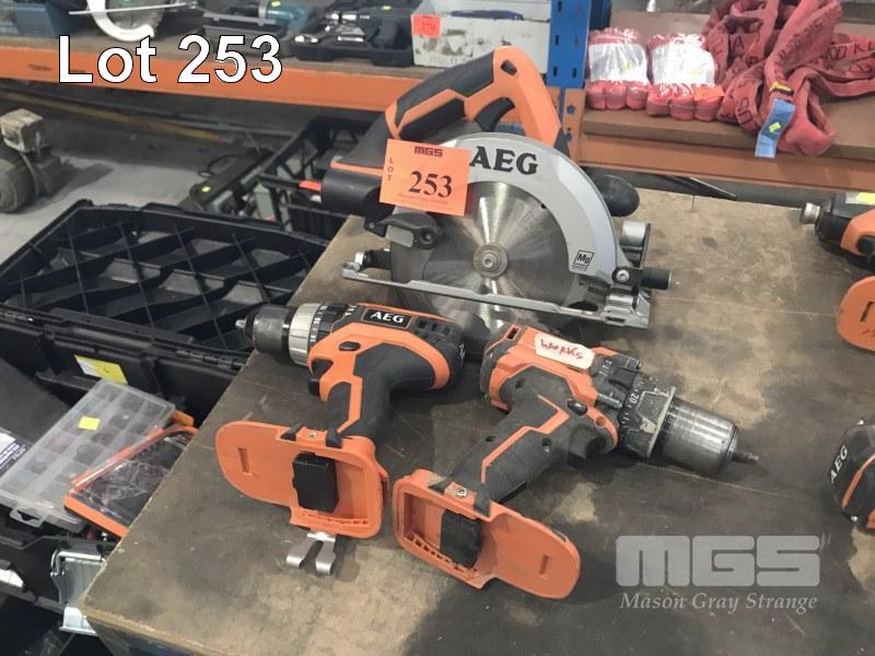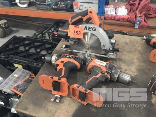 3 x AEG 18V SKINS, CIRCULAR SAW & 2 x HAMMER DRILLS