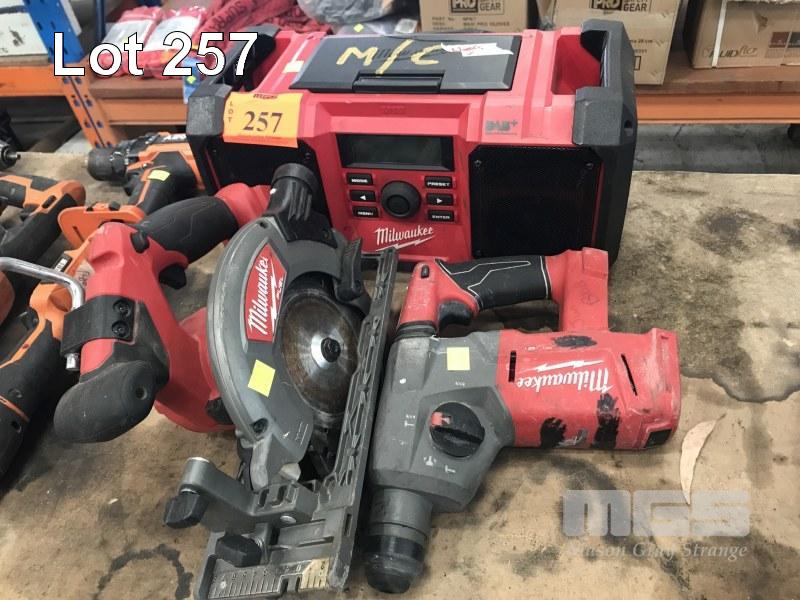 3 x MILWAUKEE SKINS, 18V SDS ROTARY HAMMER DRILL, CIRCULAR SAW & RADIO