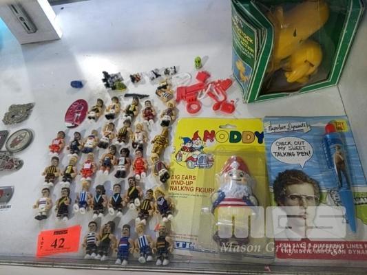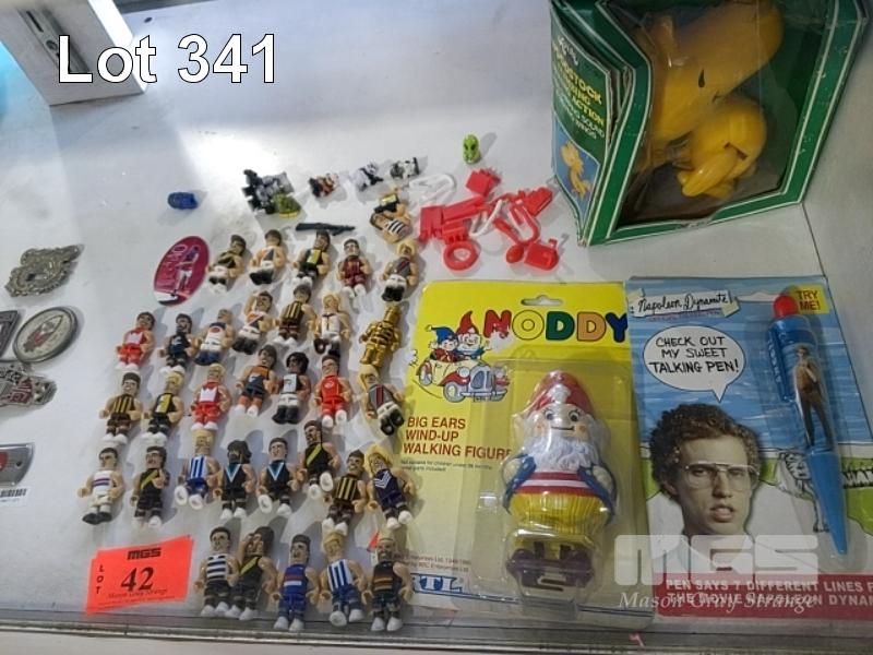 AFL MINIATURES, WOODSTOCK CLIMBING STRING ACTION NODDY, NAPOLEAN DYNAMITE PEN, ETC