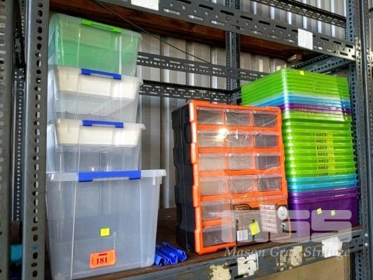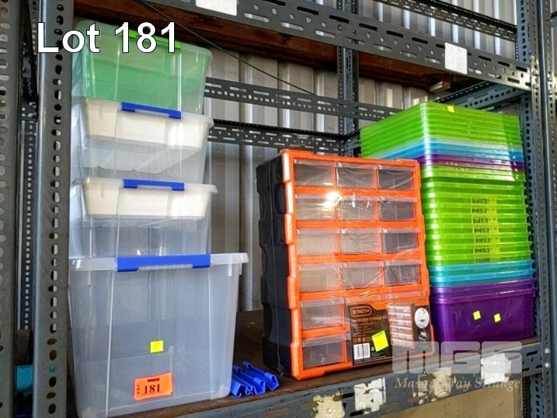 ASSORTED PLASTIC TUBS & 18 DRAWER STORAGE BIN
