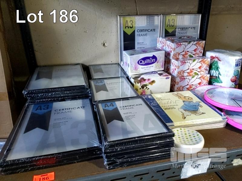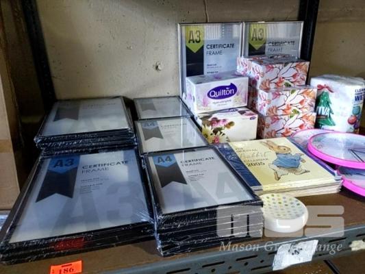 ASSORTED PICTURE FRAMES, 30X42 & 21X30, TISSUES, 3 X PINK WALL CLOCKS ETC, NEW